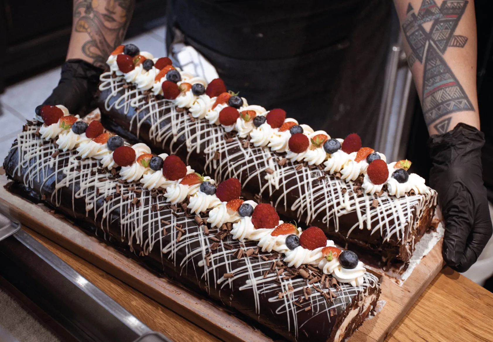 Kevyt, kuohkea ja täynnä makua. Suklaakakku kierretään rullalle ja täytetään vadelmilla sekä tuorejuusto-kermavaahdolla. Tämä ihastuttava leivonnainen viimeistellään suklaalastuilla, valkosuklaalla sekä mehukkailla mustikoilla ja vadelmilla.