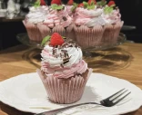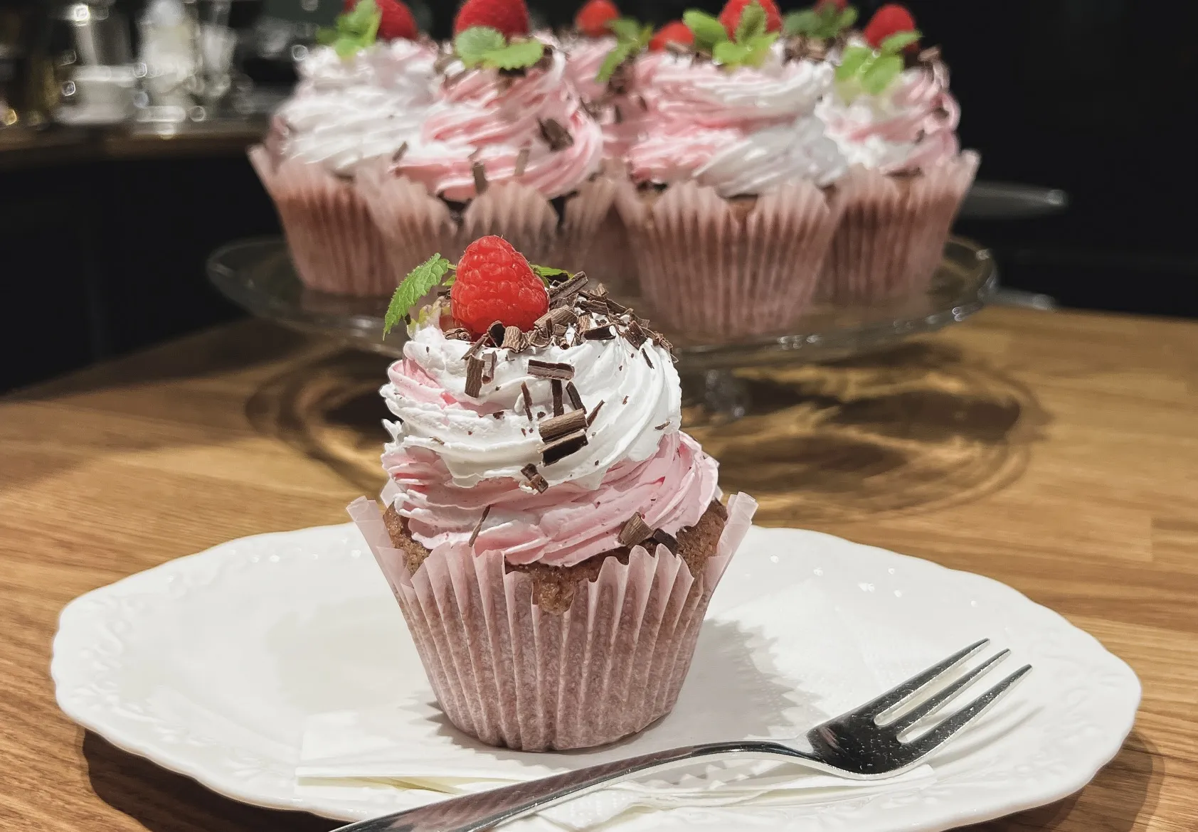 Itse tehdyt kuppikakut, joissa on kuohkea vaaleanpunainen ja valkoinen kuorrute. Päälle on lisätty tuoreita vadelmia, raastettua suklaata ja ripaus minttua. Manteliton, pähkinätön, vegaaninen ja maidoton kuppikakku.